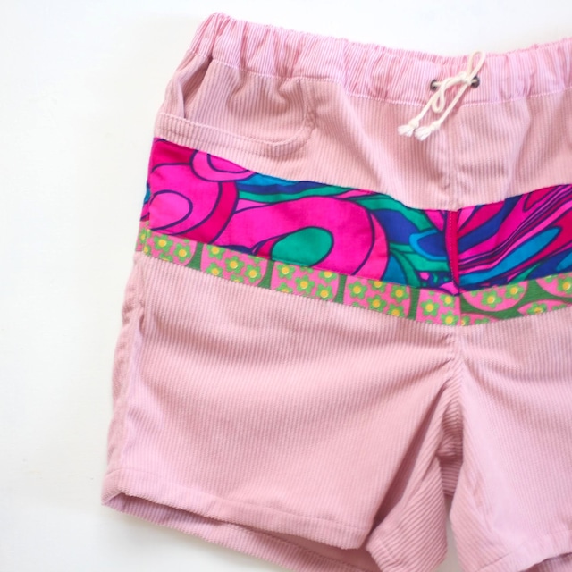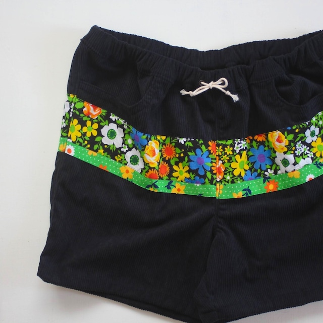 薄手で軽いコーデュロイ生地にビンテージ生地を合わせました。 動きやすくおすすめです。 ●ユニセックス Mサイズ ●平置きサイズ ウエスト80cm〜110cm 総丈40cm 股上29cm 股下11cm ✻送料無料でお届けします。